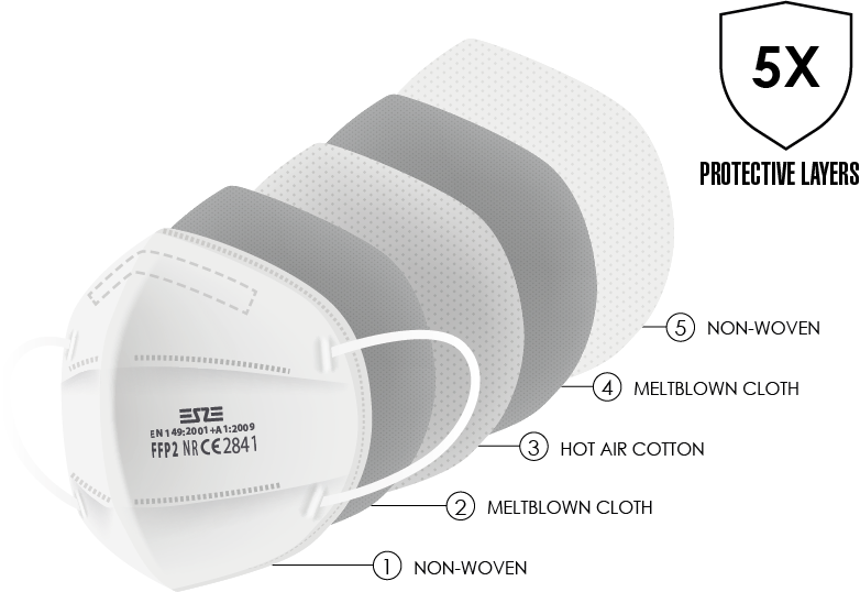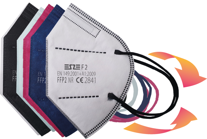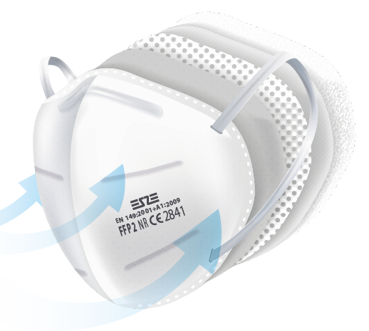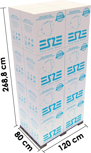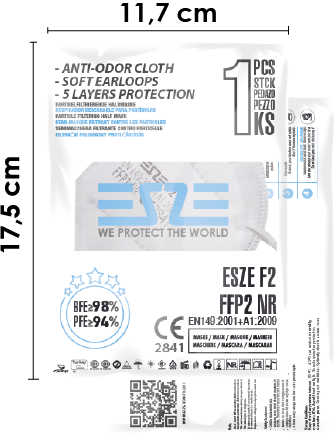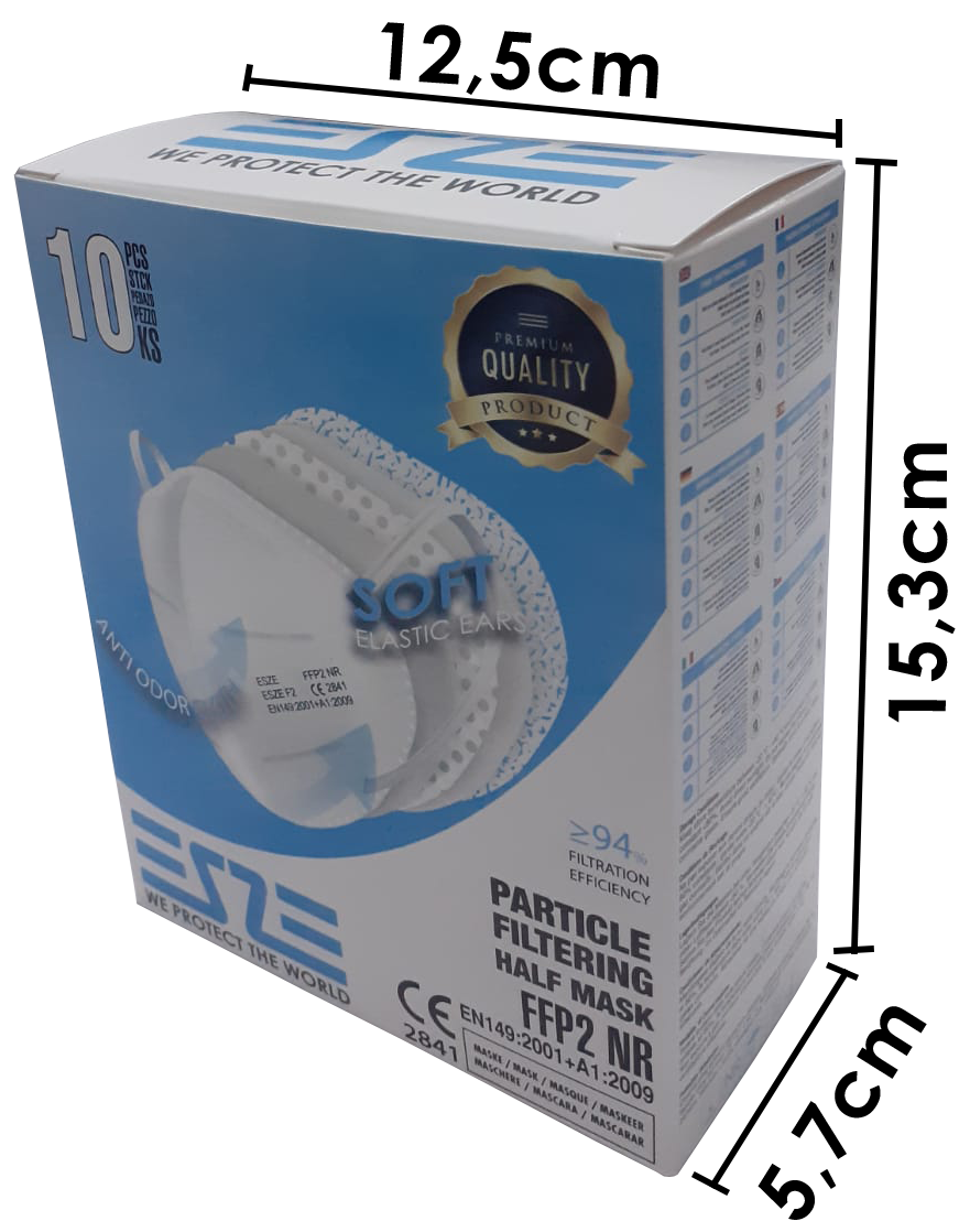 ESZE F2 | FFP2 NR EN149:2001+A1:2009 CE2841 Cloth Easy breathable high quality cloths.Our raw materials are supplied from best cloth manufacturers from Turkey and made by Made in Germany machines. Nose Sponges Protects glasses from fogs and comfortable to wear Earloops Fits to all face sizesWear directly for small faces,pull and release once for large faces. Each Mask Packed Each masks are put inside one bag 10 Pcs in one 10 pcs masks are put inside one box 120 pcs box per Total 1.200 pcs mask inside one carton 16 pcs cartons per Total 19.200 pcs mask inside one carton 96.000 pcs Mask per 80 carton in one minivan 705.600 pcs Mask per without pallet 588 carton in one truck 633.600 pcs Mask per with pallet 33 pallet (528 carton) in one truck